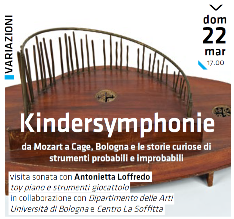Da Mozart a Cage, Bologna e le storie curiose di strumenti probabili e improbabili” – Per “Variazioni”, visita sonata con Antonietta Loffredo, pianoforte, toy piano e strumenti giocattolo. In collaborazione con Dipartimento delle Arti – Università di Bologna e Centro La Soffitta.